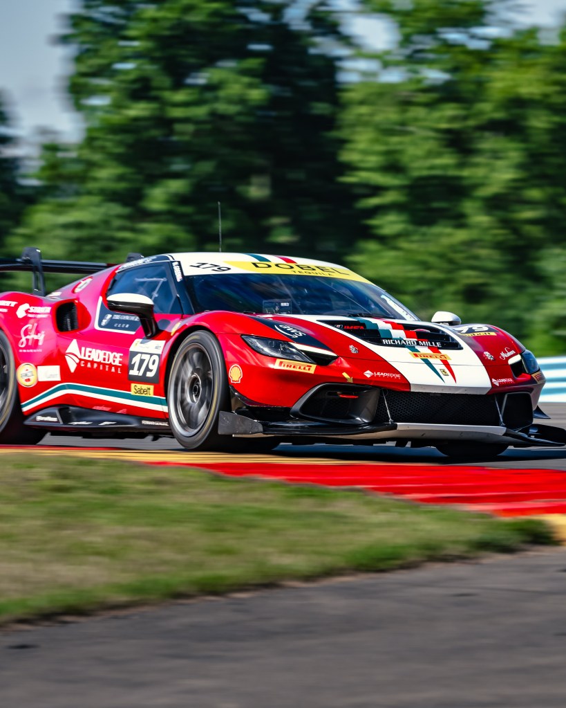 The Ferrari Challenge is a spec series, meaning all drivers race identical Ferrari 296 Challenge cars. They all race on track at the same time, but are divided into 4 different classes, based on their experience level and speed. They are only competing for position against the cars in their class. You can tell what class a car is in by looking at the colored strip across the top of the windshield.